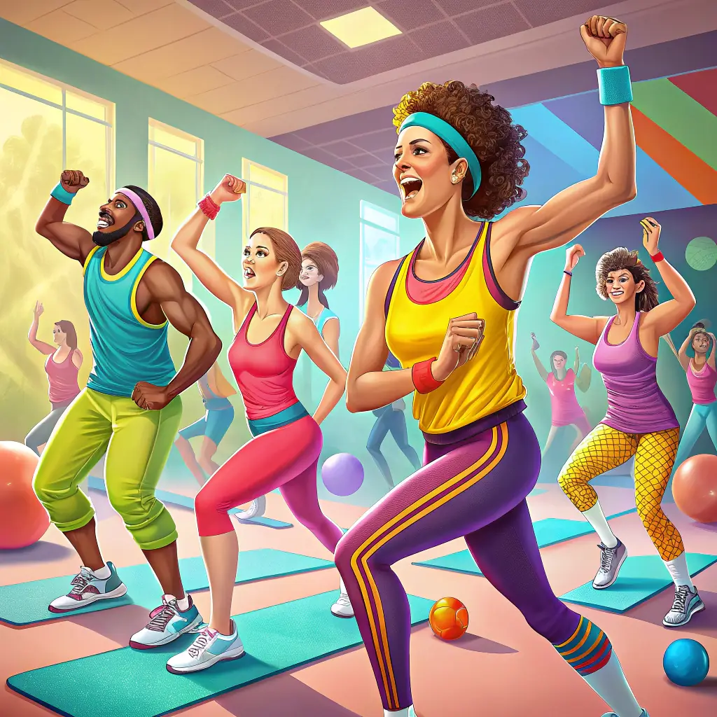 A group of people participating in a Zumba class, led by an energetic instructor, in a brightly lit studio with mirrors and motivational posters.